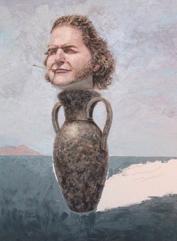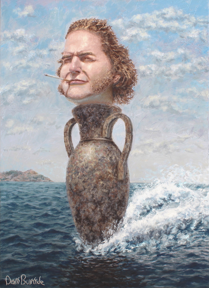 After an amazing vacation to Greece, I had hundreds of photos in my new camera. There were so many photos that would have made great paintings that I could not choose a single one- so I combined several to make Aegean Friday, with my brother Bennett Burnside as the model.