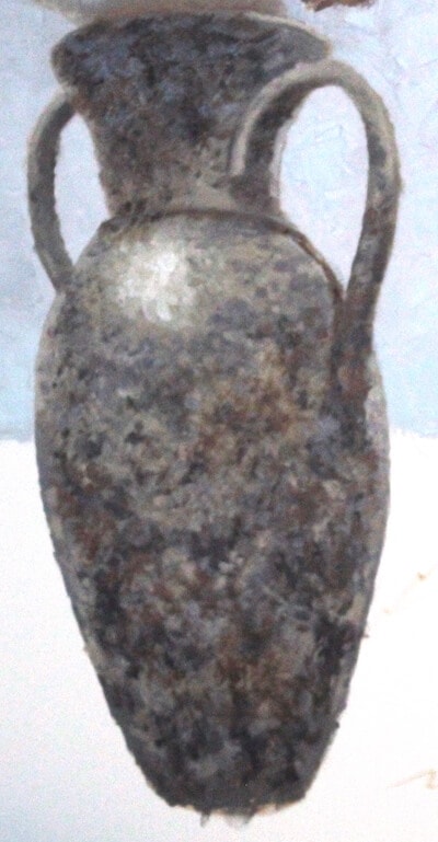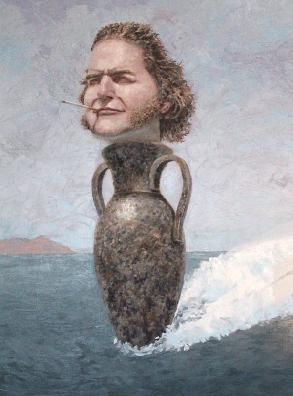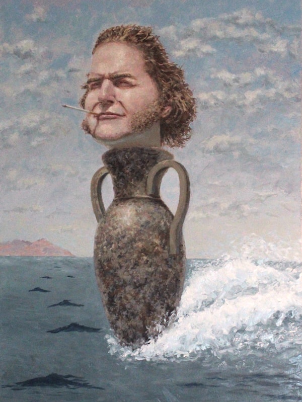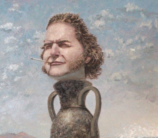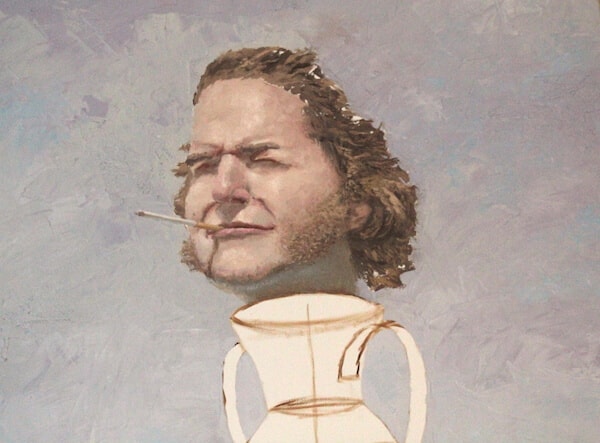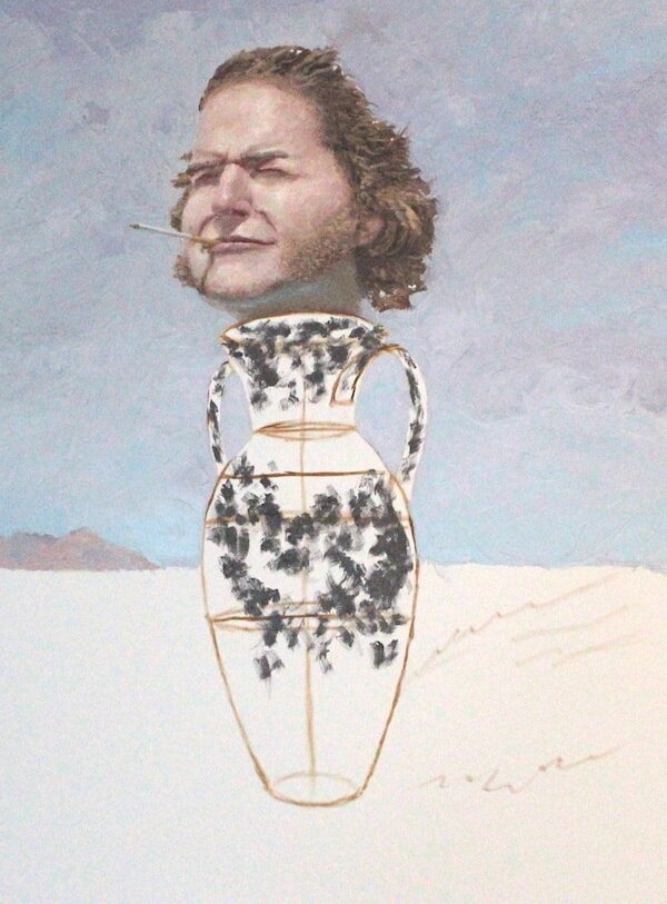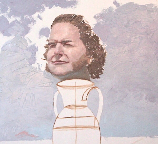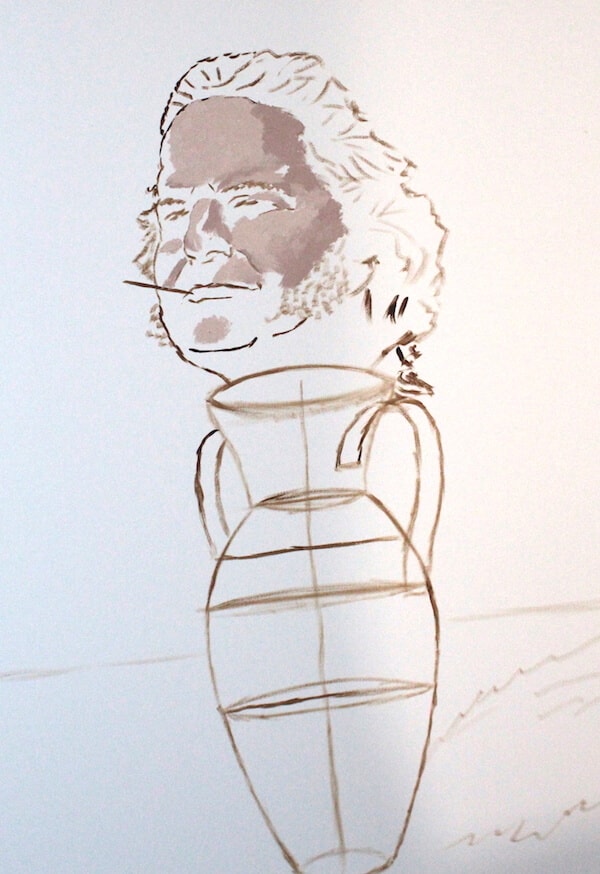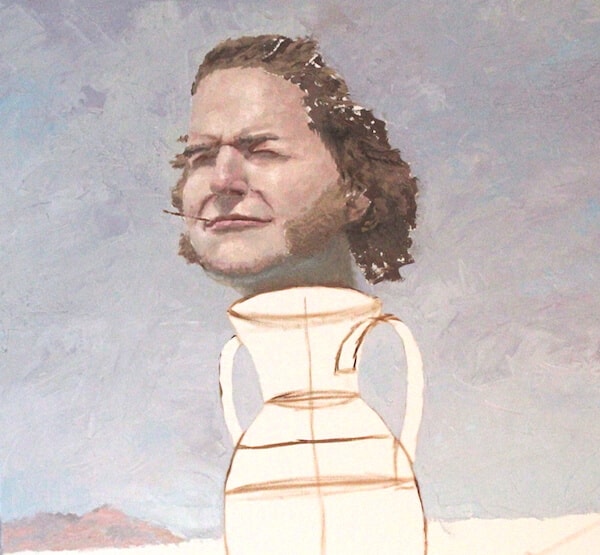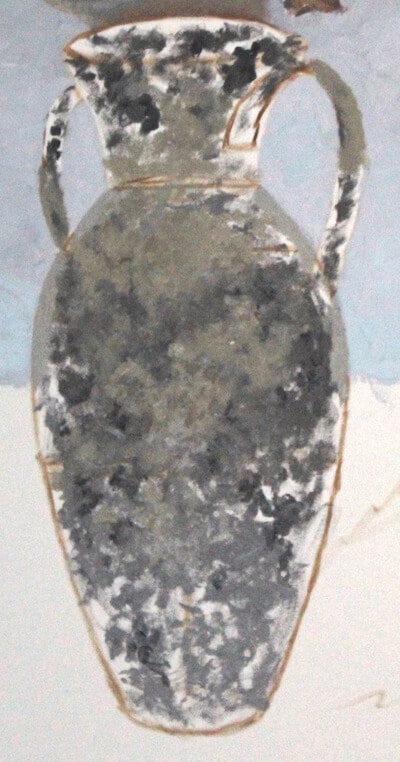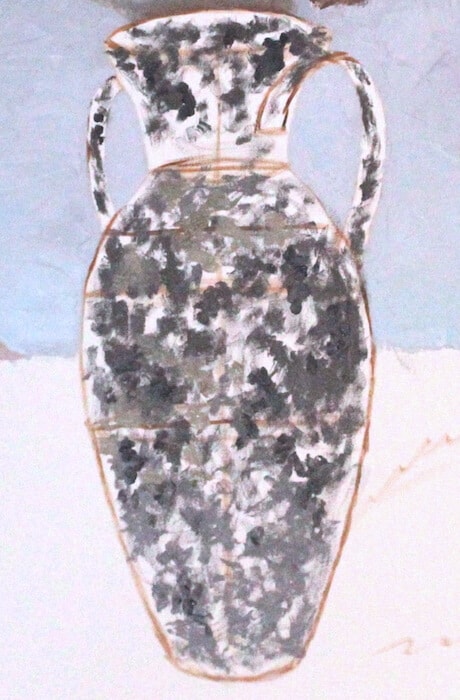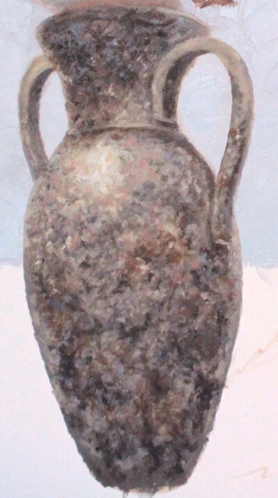 A strong highlight from the sun’s reflection, combined with another layer of dark around the vase’s bottom and the shadow of the head, really brings the vase to life. All I need to do now is refine the shape of the lip & handles with highlights and keep adding random dabs of color until I'm bored.