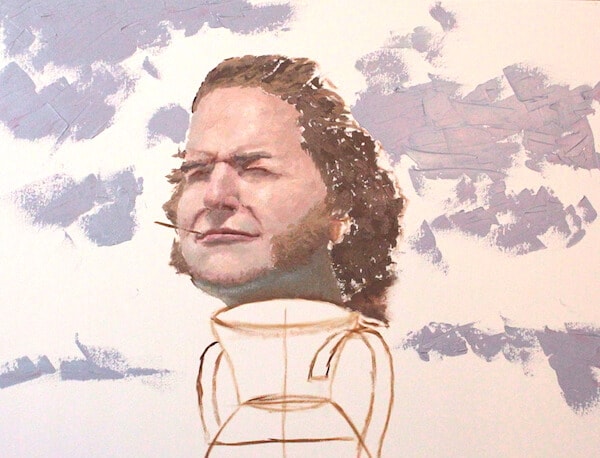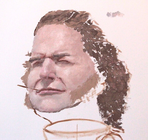 I’m using a large brush, not concerned with small details yet. The most important thing at this stage is to create the subtle color gradients across the face. The color differences between the sunlit cheeks and shaded eye sockets are obvious, but the small value difference between the front and right sides of the face,for example, are just as important. Rarely will any surface be uniformly lit.