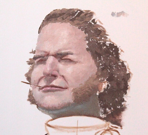 The hair is blocked in further, with the brushstrokes following the hair’s erratic windswept directions. Also notice the bright bluish patch unde the chin. This is from the ambient blue light of the water. In the reference photo, this same area is a green because of the light reflecting off Bennett’s shirt- that obviously needed to be changed, and I amplify the glow to show the strength of the water's reflections.