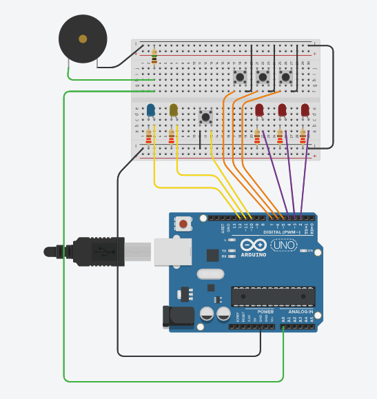 Here is a video of it in action. When the blue LED is on, the Arduino listens for a vibration, which is triggered by dropping an object on the table. When the vibration sensor is tripped, the blue LED turns off and the yellow LED turns on. The first player to press their button wins, and their corresponding red LED activates. If a button is pressed before the vibration sensor is triggered / yellow light is on, that player is disqualified for the round. Press the Reset button (out of camera view) and everybody is ready to play again.
