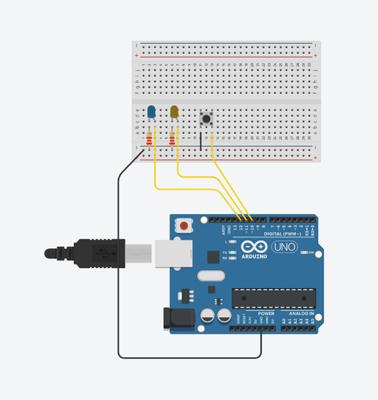 To test your wiring, delete the previous code and run this instead. When you press the button, the LEDs should alternate between on and off. If you hold the button pressed, the LEDs will continue to oscillate- (10 times a second, because of the delay call at line 31).
