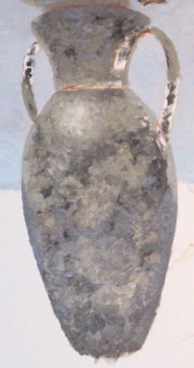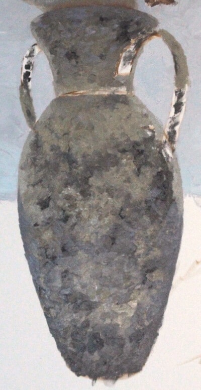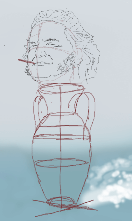 A strong highlight from the sun’s reflection, combined with another layer of dark around the vase’s bottom and the shadow of the head, really brings the vase to life. All I need to do now is refine the shape of the lip & handles with highlights and keep adding random dabs of color until I'm bored.